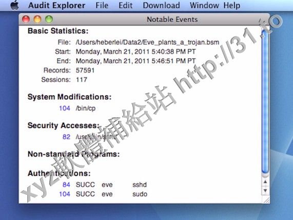 Audit Explorer analyzes the Macintosh BSM audit trails, highlights